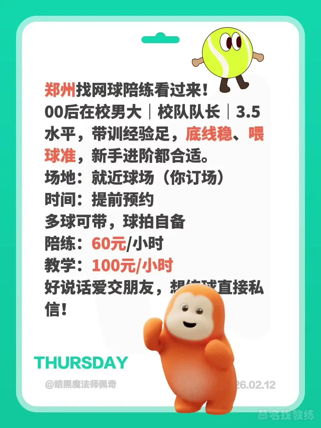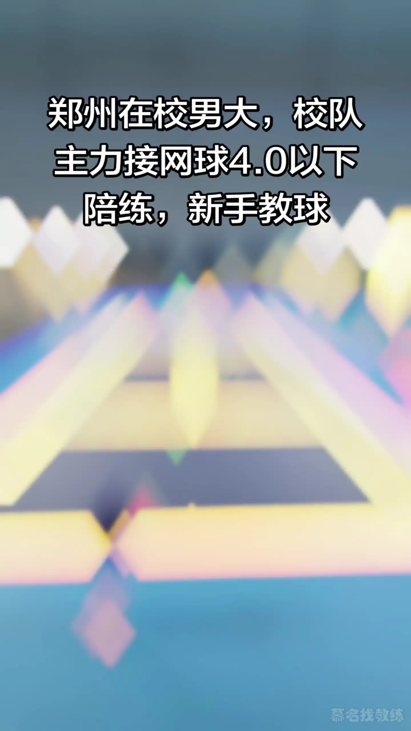 郑州网球陪练。郑州找网球陪练看过来! 00后在校男大|校队队长|3.5水平,带训经验足,底线稳、喂球准,新手进阶都合适。场地:就近球场(你订场)时间:提前预约多球可带,球拍自备陪练:60元/小时教学:100元/小时好说话爱交朋友,想练球直接私信!