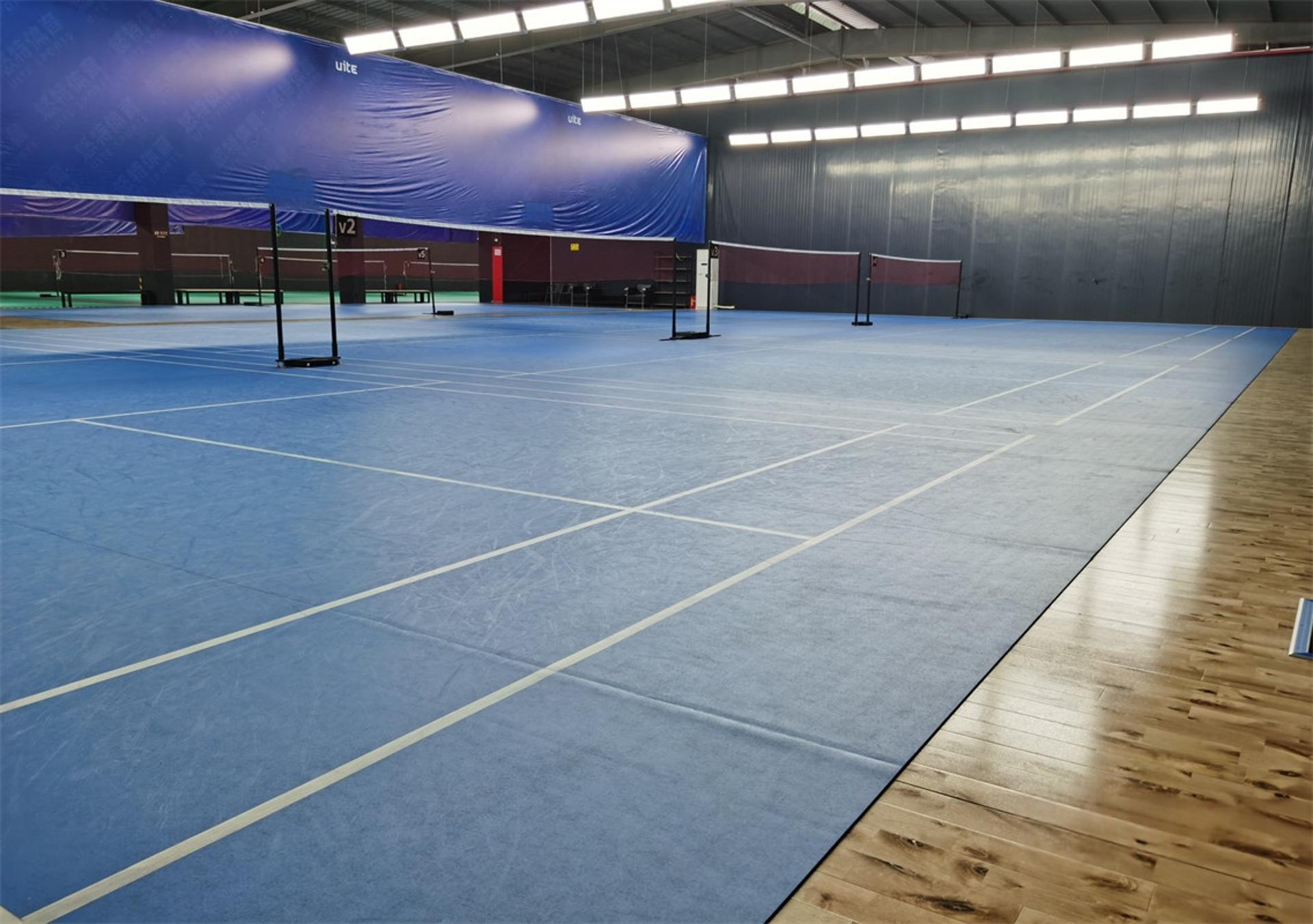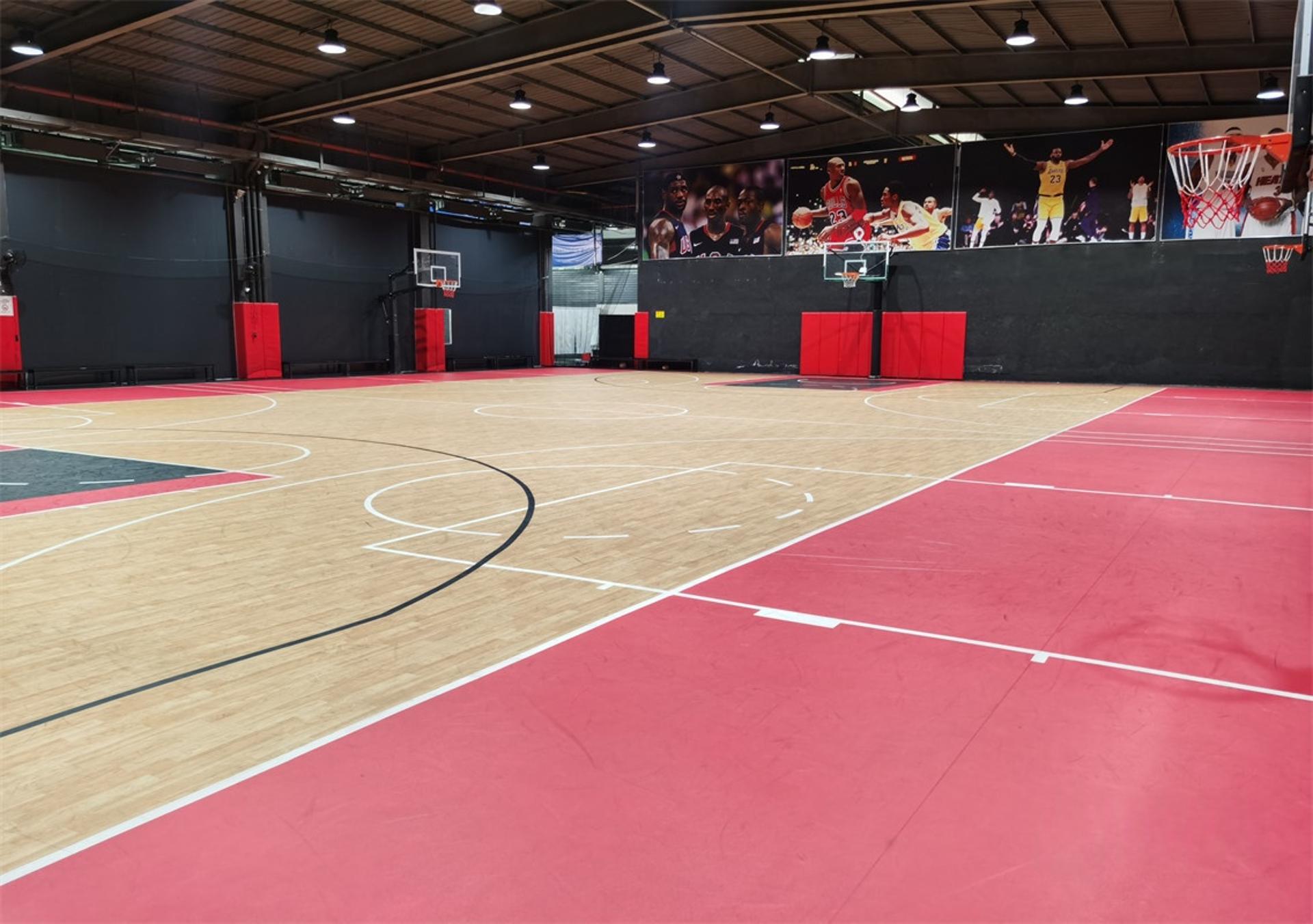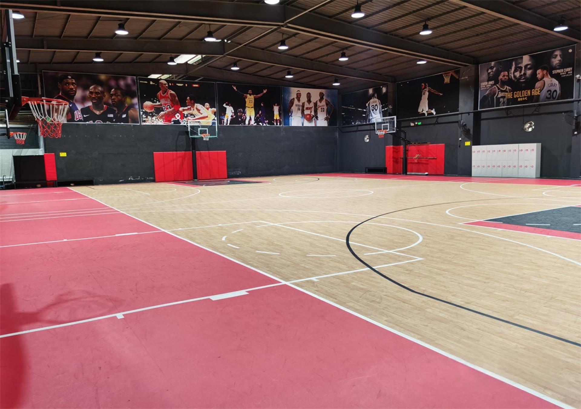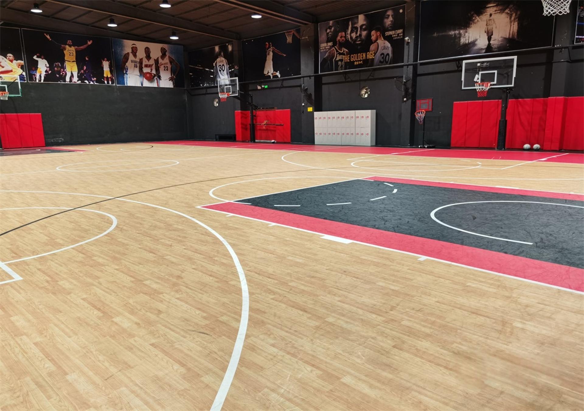 双层龙骨:普通场地 是浮地板加6.0地胶。5个VIP场都是双龙骨实木地;悬浮拼接地板;A级木地板;单层地胶