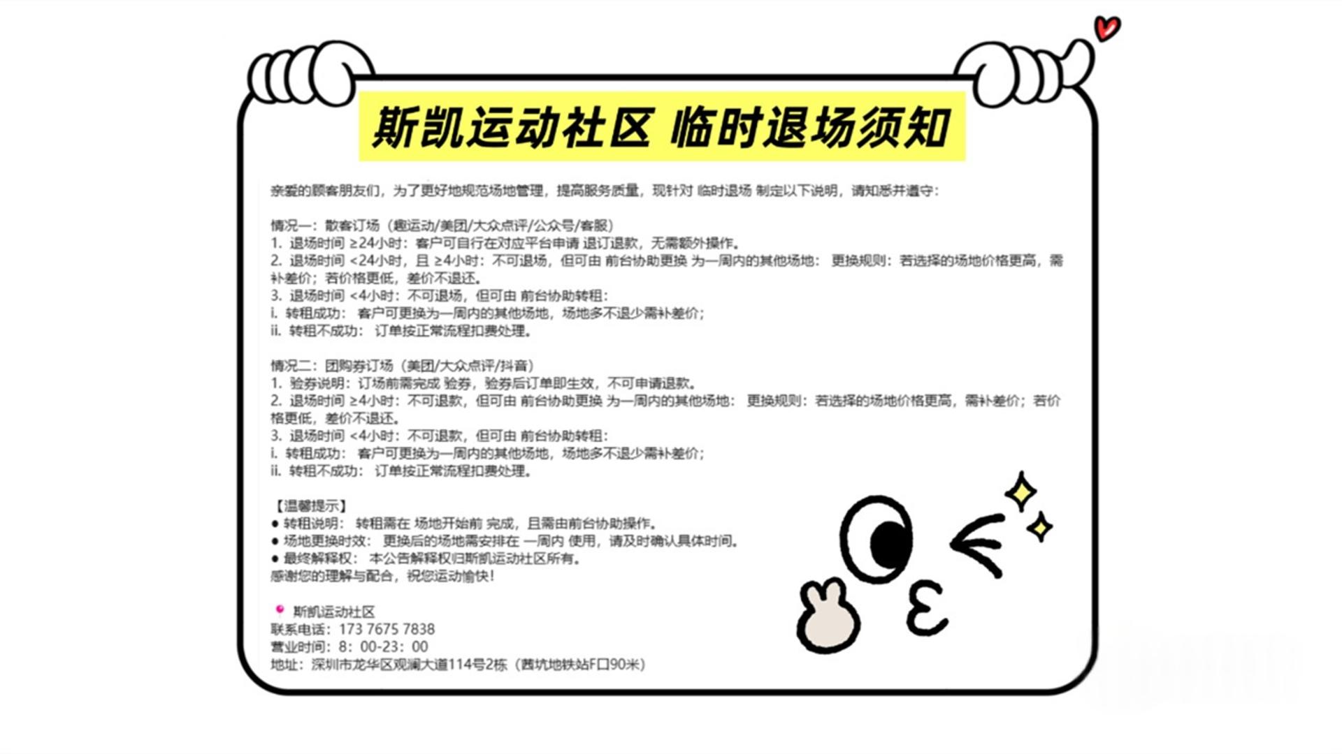 【温馨提示】 具体场地球馆可能会根据实际情况调整。 【交通信息】 停车场 斯凯停车:试运营期间免费,停车位充足 附近公交 莤坑地铁站公交站步行401米约6分钟 附近地铁 莤坑地铁站F口步行260米约4分钟