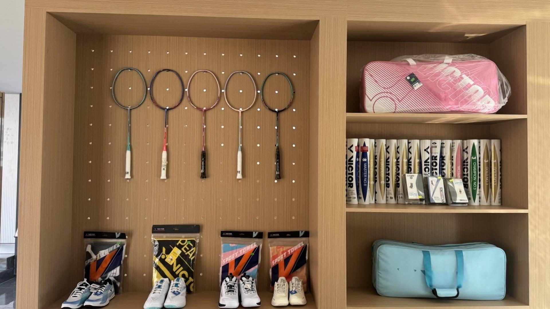 装备售卖 羽毛球:胜利;球拍:胜利,后面会有yonex;拍线;球鞋;球衣